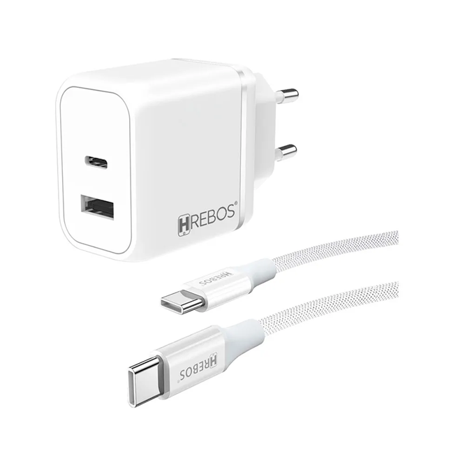 HREBOS Premium Carregador de Parede Premium 45W 1 entrada USB-C e 1 entrada USB com Cabo - Branco