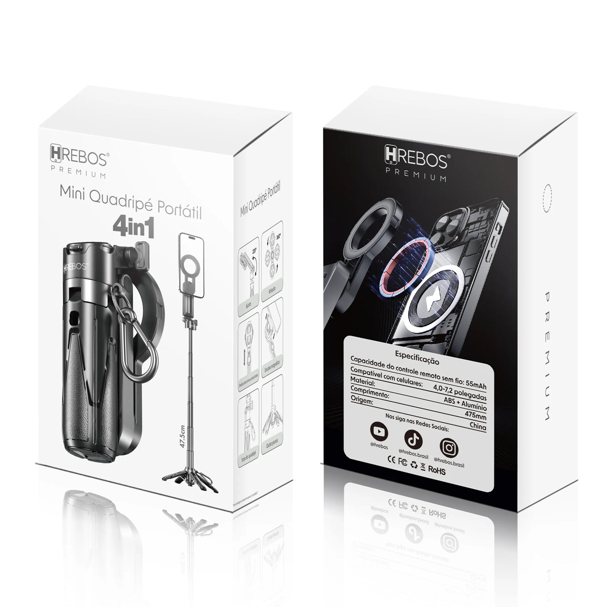 O Mini Tripé 4 em 1 Hrebos é compacto, leve e dobrável, ideal para selfies, gravações, videochamadas e muito mais.